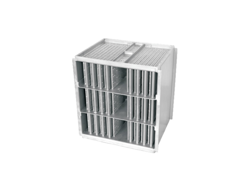 产品属于气-气列管式铝制热交换器。工作时,热气流进入热气通道入口,流经列管内壁,经热气通道出口流出;冷气流进入冷气通道入口,流经列管间外壁:热气流经降温后冷凝分离出其内的水汽,以达到干燥空气的目的,为后续涡轮压缩制冷创造条件。